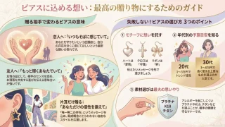 ピアスのプレゼントの意味について、贈る側の心理や位置、数の違いまで解説します。大切な方へピアスをプレゼントする意味を正しく理解すれば、20代や30代の予算相場や失敗しないブランド選びもスムーズに。金属アレルギーへの配慮など、喜ばれるギフト選びをふるさんが優しくナビゲートします。