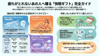 大切な両親へいつまでも元気でいてほしい。そんな想いを叶える親に贈る健康や安眠のギフト選びを徹底解説。70代や80代の睡眠の悩みから、人気のリカバリーウェアや家電の予算相場、マナーまで網羅。失敗しない親へ贈る健康や安眠のギフトを見つけて、心からの感謝を最高の形で届けましょう。