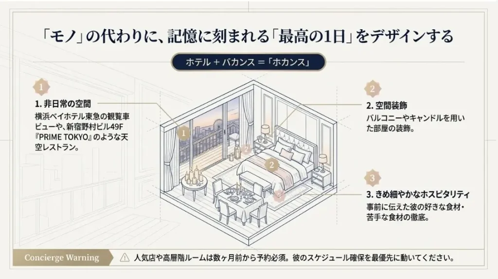 また、最近では「ホカンス(ホテル+バカンス)」という言葉があるように、どこかへ出かけるだけでなく、高級ホテルの部屋をバルコニーやキャンドルで装飾し、二人きりで贅沢に過ごすスタイルもトレンド。演出の際は、彼の性格(目立つのが好きか、静かに過ごしたいか)に合わせてプランを練るのが成功の鉄則です。彼が好きな食材、苦手な食材を事前に伝え、きめ細やかなホスピタリティを提供してくれる場所を選ぶことが、最高の1日を完成させる最後のピースになります。
