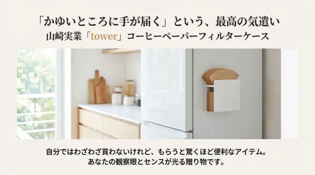 また、整理整頓が得意な方やインテリア好きな方なら、山崎実業の「tower(タワー)」シリーズのコーヒーペーパーフィルターケース(約2200円前後)も意外なヒットになります。フィルターの収納って、実は多くの方が「袋のまま放置している」という悩みを抱えている場所なんです。マグネットで冷蔵庫の横にペタッと貼れるtowerのケースは、「自分ではわざわざ買わないけれど、もらうとキッチンがすっきりして最高に便利」なアイテムの典型です。こうした「かゆいところに手が届く雑貨」は、あなたの観察眼と気遣いを証明してくれる、センス溢れる贈り物になりますよ。