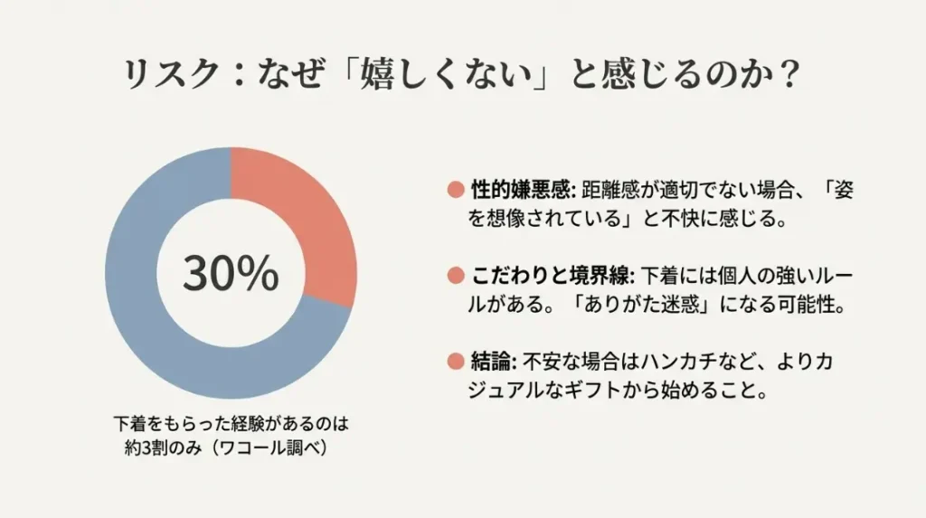 嬉しくないと感じる主な理由は、やはり下着というものの性質上、どうしても「性的なイメージ」が付きまとってしまうからです。たとえ贈る側に下心がなかったとしても、受け取る側は「この下着を履いた姿を想像されているのかな?」と生理的な嫌悪感を抱いてしまうことがあります。特に女性が、あまり親しくない男性から下着を贈られた場合、それはプレゼントという枠を超えて「セクシャルハラスメント」や「常識外れ」と受け取られかねない、非常にデリケートな問題なんです。また、下着は人によって「履き心地」や「こだわり」が非常に強いアイテム。自分が選んだお気に入りのもの以外は身に着けたくないという方も多く、他人が選んだものは「ありがた迷惑」になってしまうリスクが高いことも忘れてはいけません。