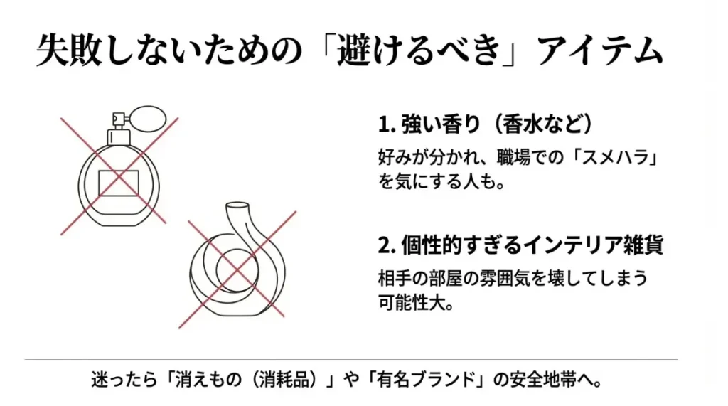 まず、好みが激しく分かれる「強い香り」のアイテム。特に香水や、海外製の非常に香りが強いボディクリームなどは要注意です。職場での使用を想定している場合、周りへの配慮(スメルハラスメント)を気にする女性も多いため、無難な柑橘系や無香料に近いものを選ぶのが賢明です。また、個性が強すぎるインテリア雑貨も、相手の部屋の雰囲気を壊してしまう可能性があるため、親しい間柄でない限りは避けたほうが無難ですね。