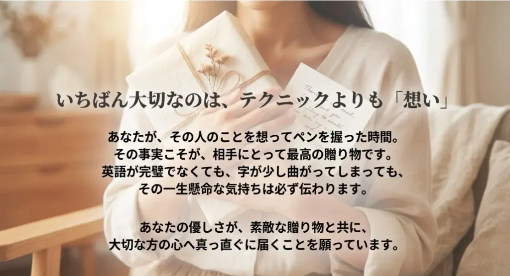 いろいろなコツをお話ししましたが、私が一番伝えたいのは、どんなにテクニックを駆使するよりも「あなたがその人のことを想ってペンを握った」という事実こそが、相手にとって最大のプレゼントになるということです。英語が完璧でなくても、字が少し曲がってしまっても、その一生懸命な気持ちは必ず文字の端々から伝わります。今回ご紹介したフレーズや書き方は、あくまでもあなたの「届けたい気持ち」を少しだけ助けるためのツールに過ぎません。