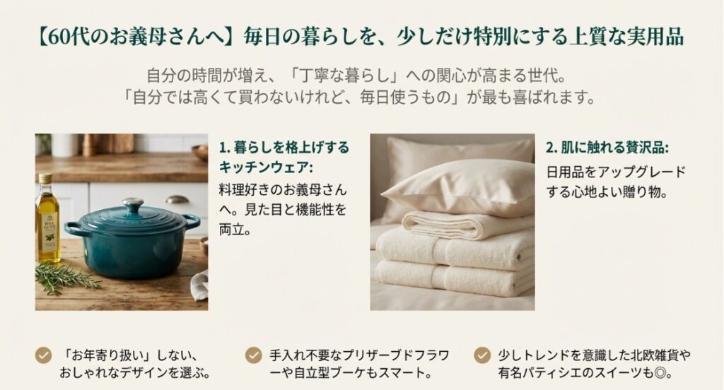 60代のお義母さんは、今まさに「人生の黄金期」を迎えている世代です。子育てが一段落し、定年退職などで自分自身の時間が増える時期。一方で、体力の変化を少しずつ感じ始める年代でもあります。この世代のお義母さんには、「生活をワンランク格上げしてくれる実用品」が最も刺さります。私が見てきた中でも、60代の方からは「自分では高くて買わないけれど、毎日使うもの」が一番喜ばれていますね。