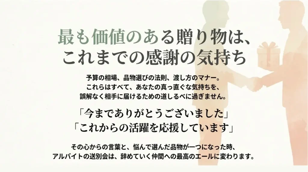 なぜなら、バイトの送別会プレゼントの相場(1,000円~3,000円)は、そもそも「お返しは不要」という前提の金額設定であることが多いからです。送別会での丁寧なお礼の挨拶(スピーチ)や、後日のお礼メールで、感謝の気持ちをしっかり伝えれば十分とされています。