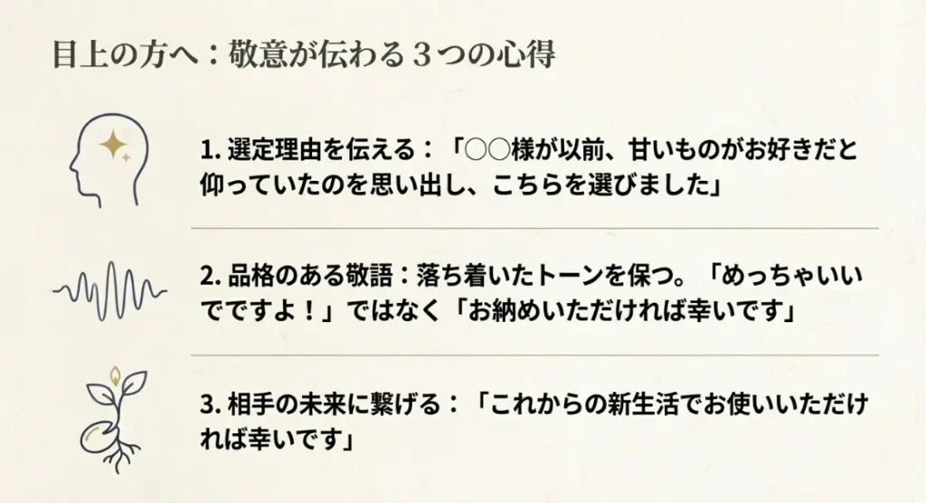 親しみやすさを出そうとして、敬語を崩しすぎてしまうのは逆効果です。「これ、めっちゃいいですよ!」ではなく、「心ばかりの品ですが、日頃の感謝のしるしにお納めいただければ幸いです」といった、落ち着いたトーンを維持しましょう。目上の人は、あなたの「丁寧であろうとする努力」そのものを評価してくださることが多いので、背伸びしすぎず、誠実な言葉を選んでみてくださいね。