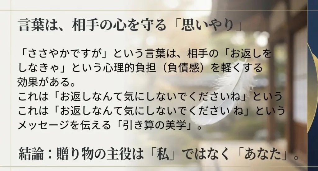 「素晴らしいものをお贈りします!」と高らかに宣言して渡すと、相手は「同じくらい素晴らしいものを返さなきゃ」という、ある種の「負債感」を感じてしまうことがあります。そこで「ささやかですが」と付け加えることで、「これは本当に小さなものだから、お返しなんて気にしないでくださいね」というメッセージを伝えているんです。この「引き算の美学」こそが、相手への真の配慮だなと感じます。