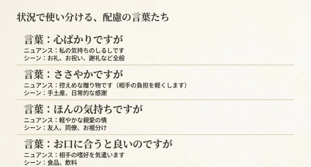 もうひとつ使いやすいのが「ささやかですが」です。これは、あまり高価すぎるものを贈ると相手が「お返しをしなきゃ」と身構えてしまうような時に効果的。あえて「ささやかなもの」と表現することで、相手の心理的な負担を軽くしてあげる優しさが込められています。特にちょっとした手土産や、日常的なお礼のシーンにはぴったりかなと思います。