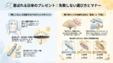 • NGアイテムには配慮を: ハンカチや日本茶など、誤解を招く可能性のあるアイテムを知っておき、贈る場合はメッセージでフォローする気遣いを。