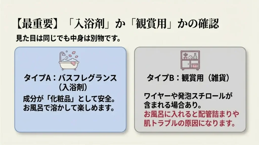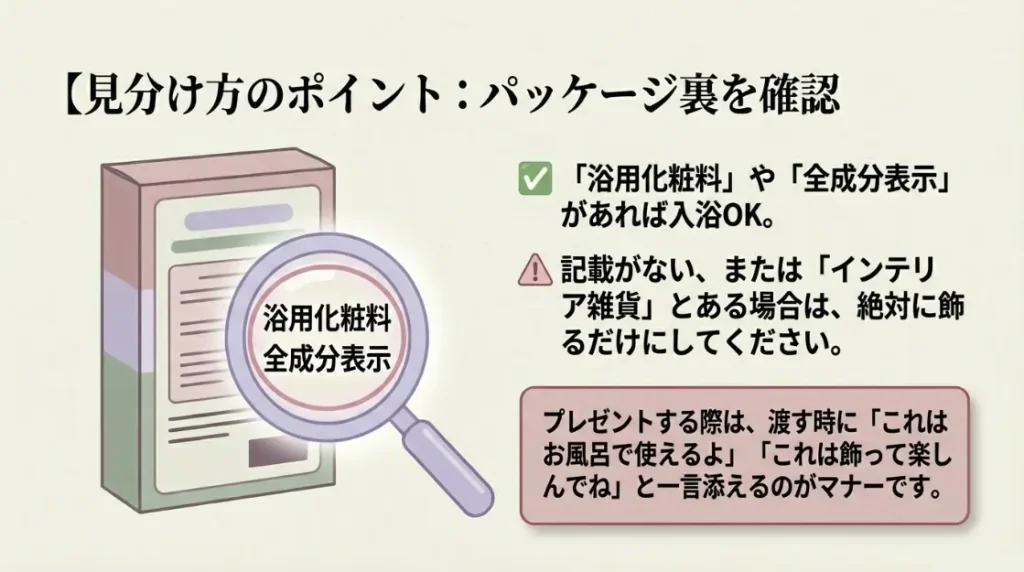 見分け方はとても簡単で、パッケージの裏側をしっかり見ることです。入浴剤として使えるものには、必ず全成分が表示され、販売元として「浴用化粧料」といった記載があります。逆にそれらの記載がなく、単に「インテリア雑貨」や「食べられません」といった注意書きのみのものは、飾る専用だと判断してください。「せっかくだからお風呂でも楽しんでね」と伝えて渡すなら、必ず化粧品登録がされている製品を選ぶのが誠実な贈り主としてのマナーですね。もしプレゼントとして貰った側が判断に迷うようなら、無理に使用せず、まずは香りを楽しむ芳香剤として活用するようにアドバイスしてあげるのが一番安心かなと思います。