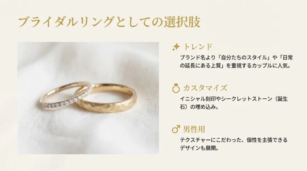 結婚指輪(マリッジリング)選びにおいて、アガットは「自分たちらしさ」を大切にするカップルに選ばれています。一般的な結婚指輪はシンプルなプラチナの甲丸リングが多いですが、アガットは違います。職人の手仕事を感じさせるマットな質感のゴールドや、アンティークジュエリーのような繊細なミル打ち(小さな粒の装飾)を施したリングなど、唯一無二の存在感を持つものが揃っています。